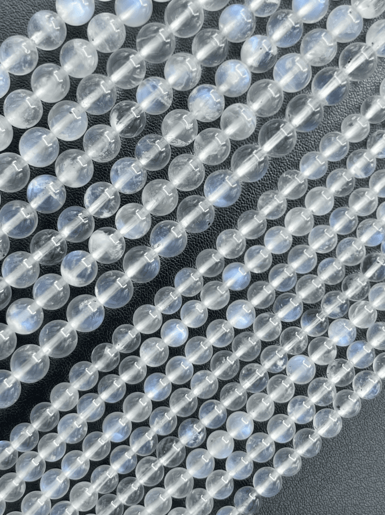 Take a Moonstone in your hand, turn it in your fingers and watch the tiny fibres inside as they interact with the light source and act as ‘scattering centres’ of those rays, which in turn produces that ethereal, beneath the surface blue-glow in the Gemstone. This is why Moonstone makes the most beautiful pieces of Jewellery, as it doesn’t take much to set them off! These Moonstone Beads are dancing, full of optical brilliance.