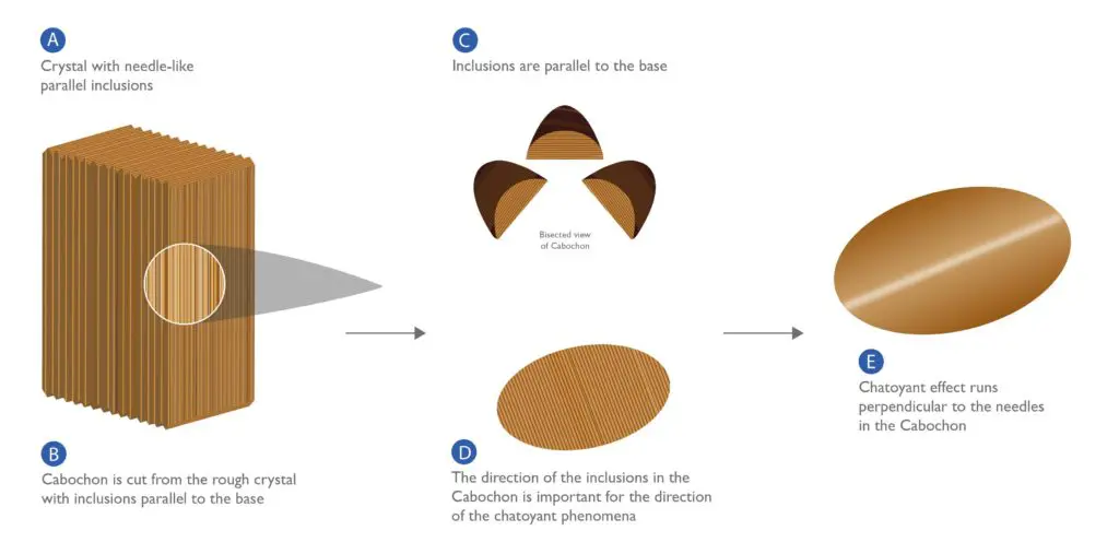 Chatoyant Gemstones are usually cut as Cabochons, Beads or Collectables, which shows off the Chatoyant effect. However, this is not just a simple case of cutting the Stone as it takes great skill to ensure the quality of the carving. It is paramount that the Gem is cut in a precise way. We have drawn a diagram here to show Chatoyancy in Tigers Eye. Look at how the Cabochon needs to be cut perpendicular to the internal fibre-inclusion direction to harness that marvellous Chatoyant effect.