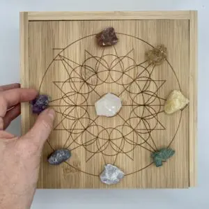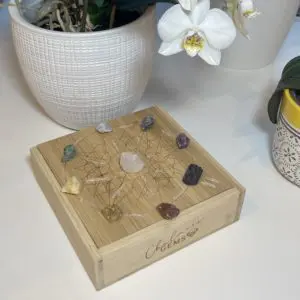 This bespoke CHAKRA CRYSTAL GRID BOX SET is constructed from 100% Bamboo and is adorned with an exclusive sacred etching of a Mandala bespoke to Chalmers Gems. Inscribed with the Chalmers Gems marque, you are guaranteed the quality & value that we put into every product we sell.