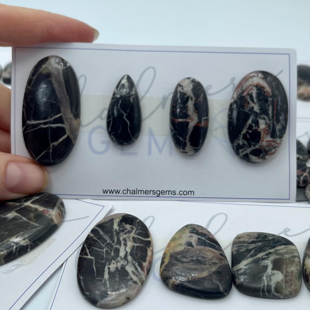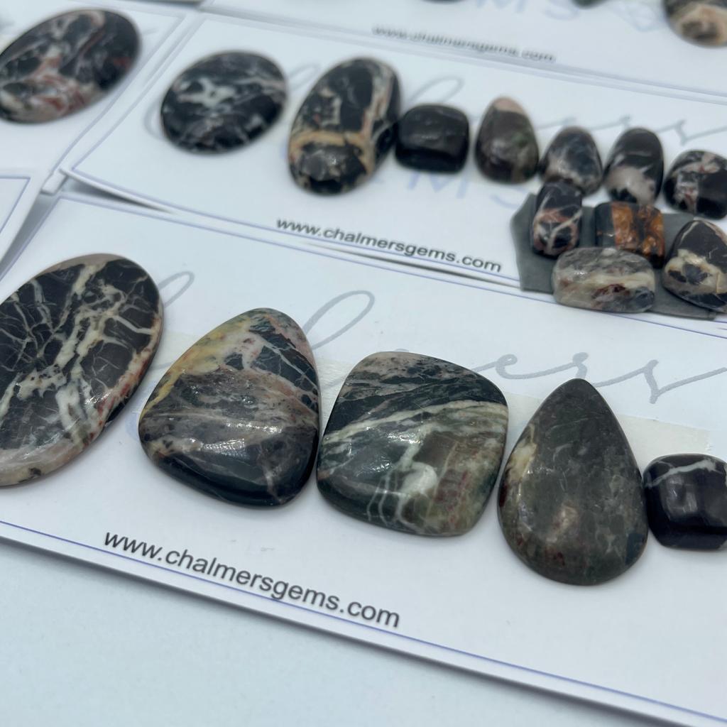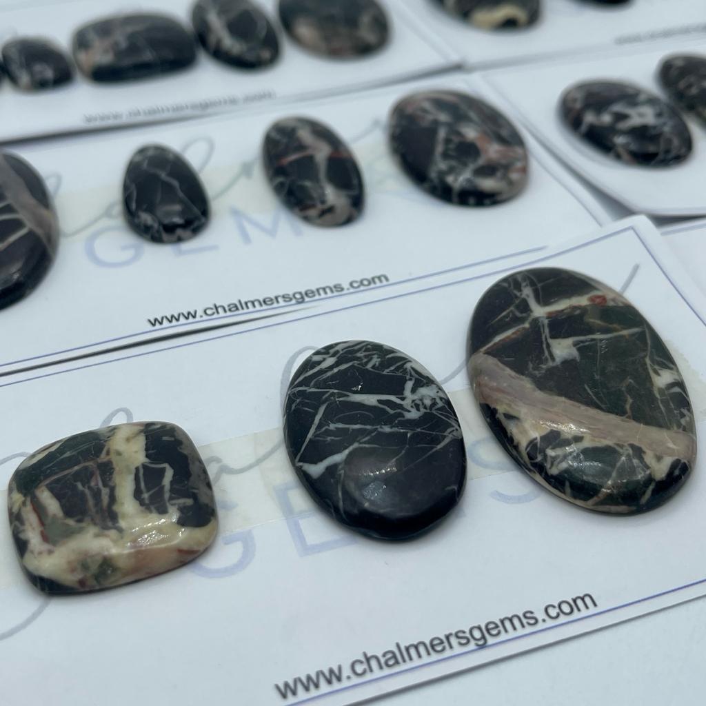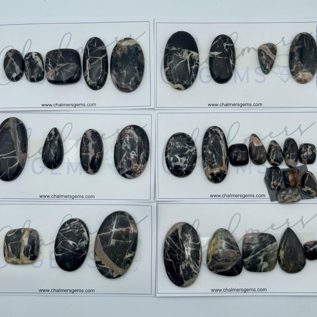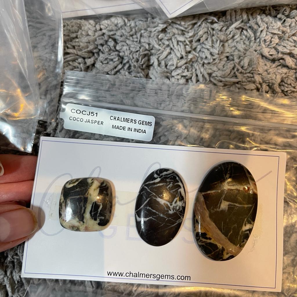 Within your Cabochon Pack of Coco Jasper, the patterns start with a high polished dark, black base and are embellished with curious veins of light minerals, giving it stunning white, and sometimes, golden highlights. This unique shading is caused by its high mineral content & how it compounds of millions of years.
