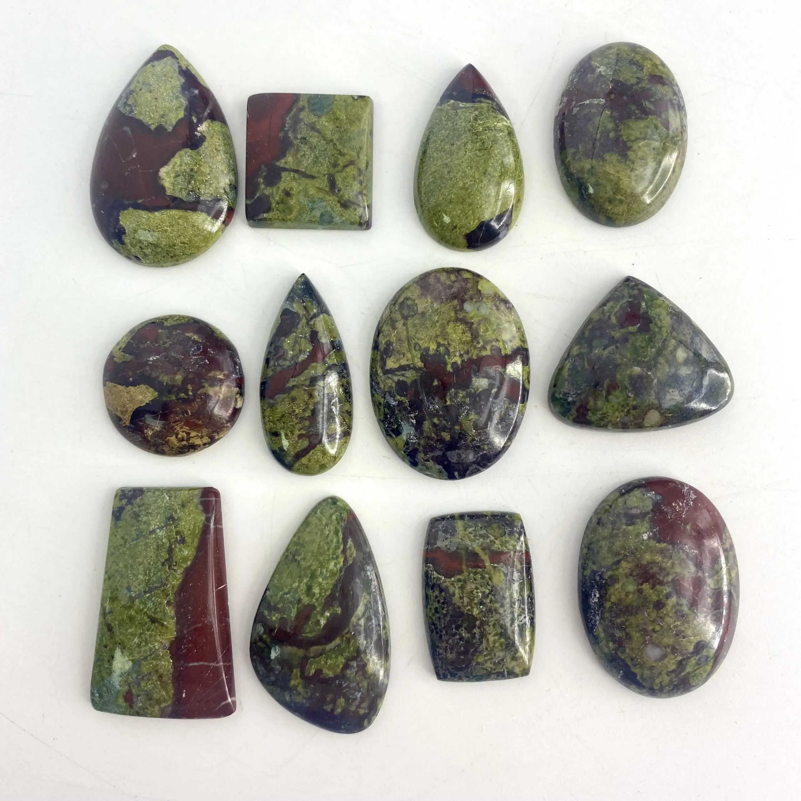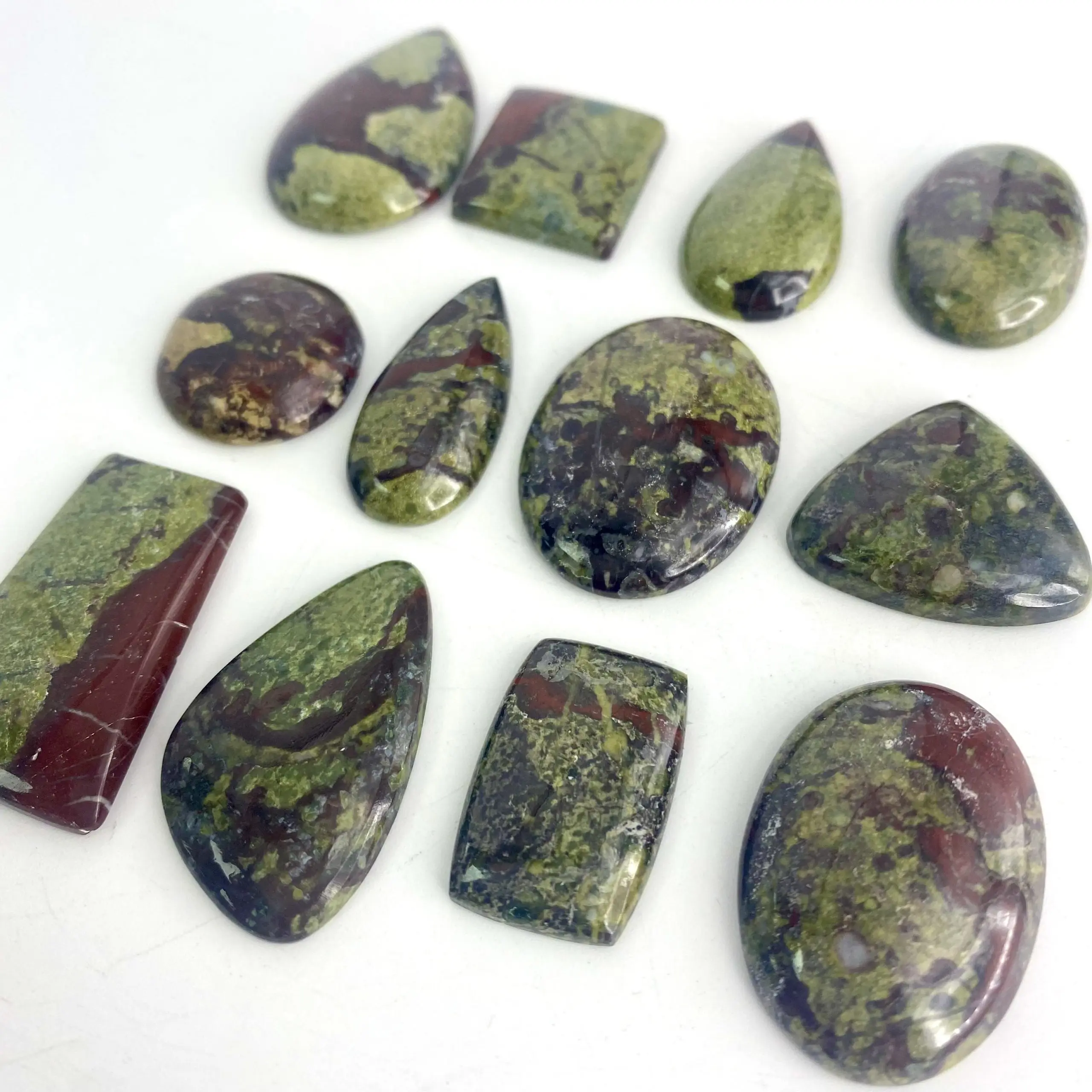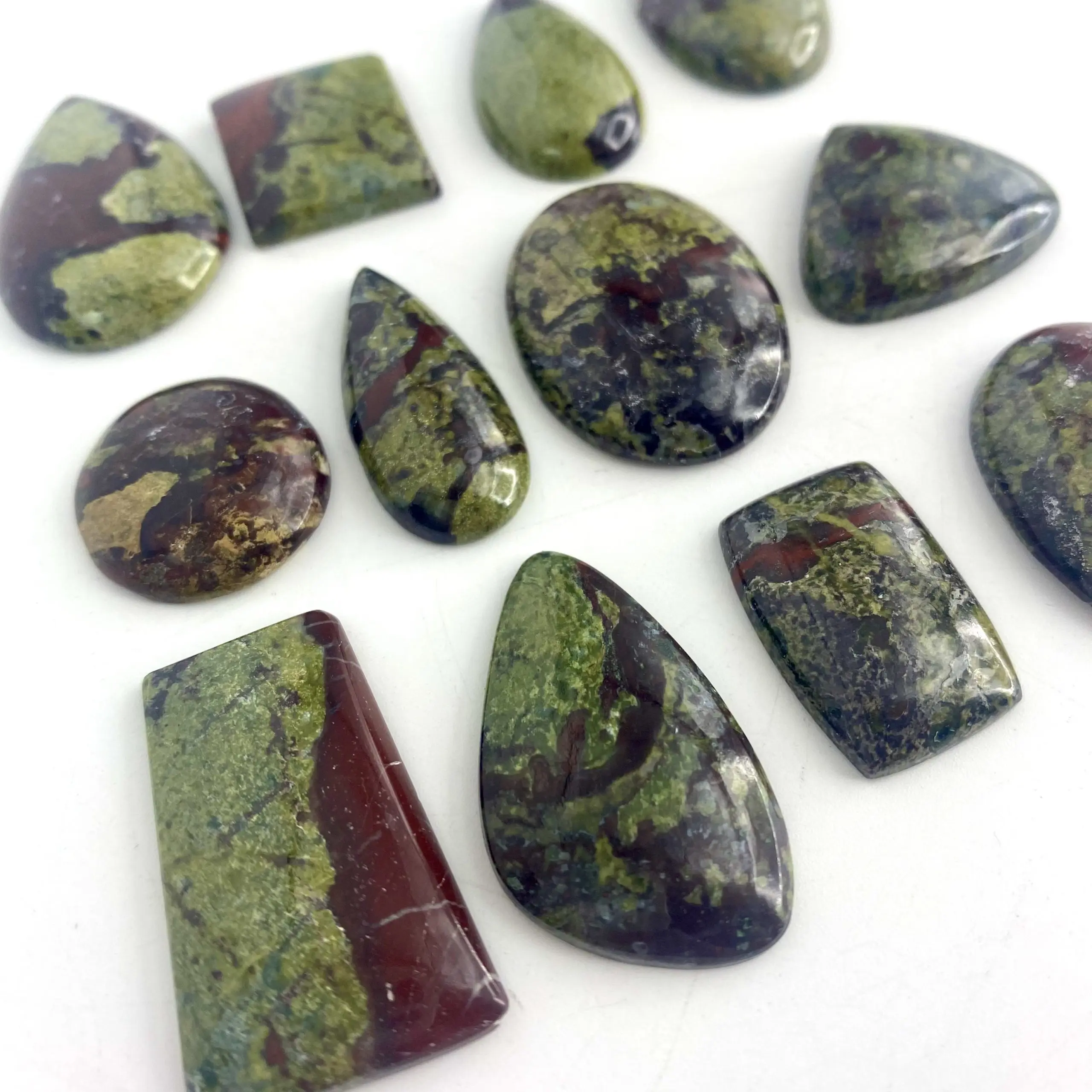 Our Dragon Blood Jasper Mixed Shape Cabochons have been cut by experts to exhibit their fantastic patterns to full aplomb! In Packs of 3 pieces, these beautiful Cabochons are valued for their deep red and green patterns colour.