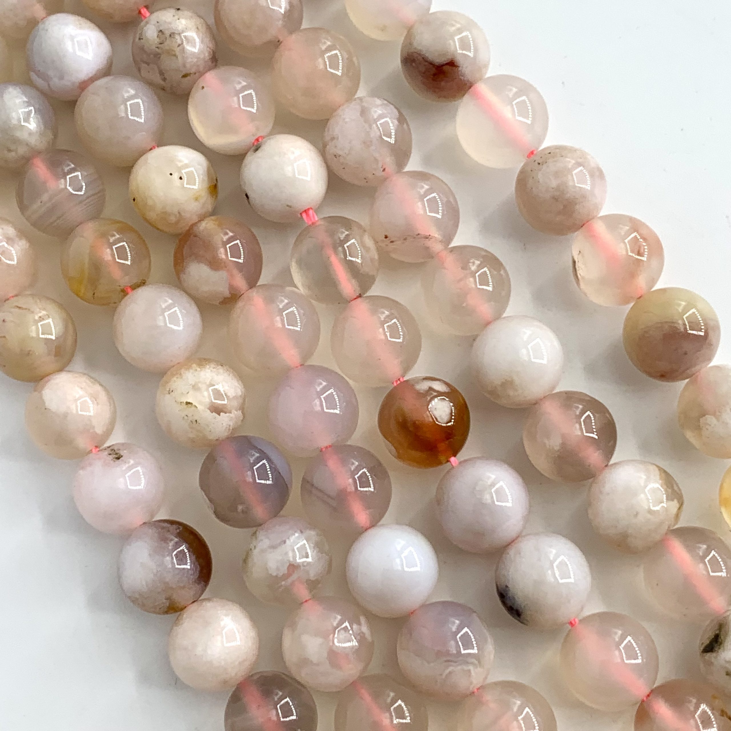 Beautiful pale pink Flower Agate 8mm Smooth Rounds come on a 38cm Strand. Each Bead has been expertly cut to showcase this magical Gemstone’s stunning tones and patterns.