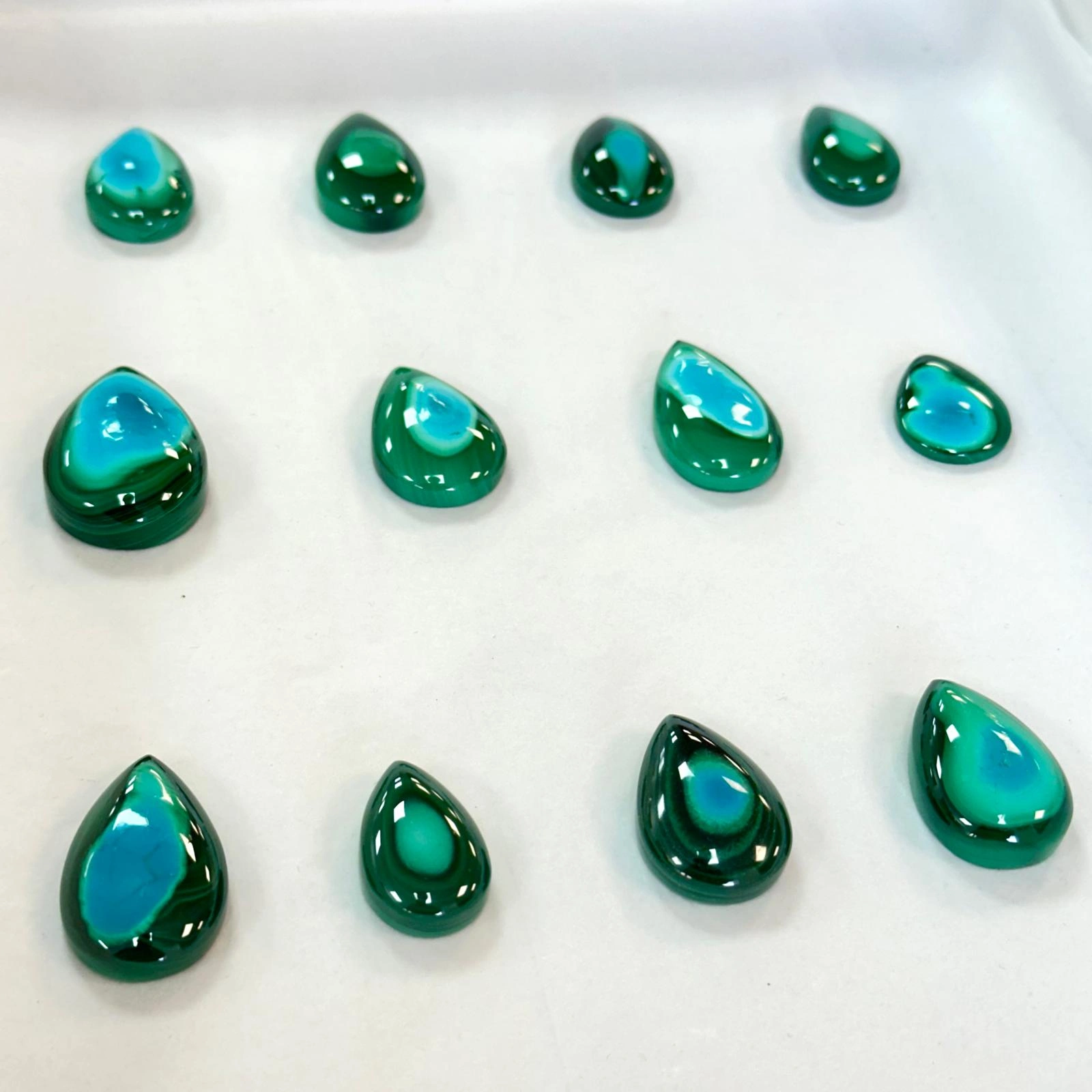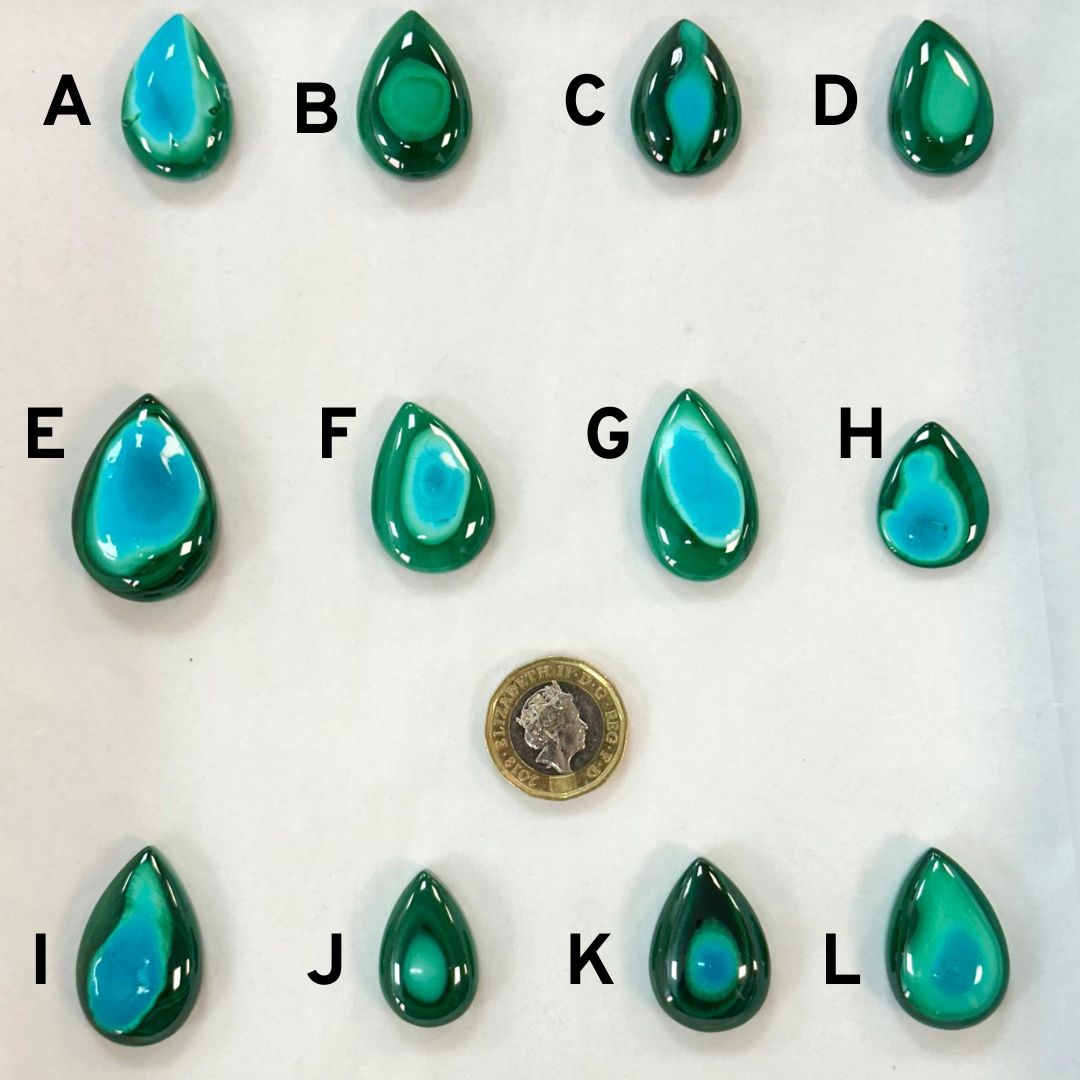 These pear shaped Malacolla Cabochons come in a variety of sizes for you to choose from. They are all undrilled, making them perfect for creating a unique piece of gold or silver jewellery.