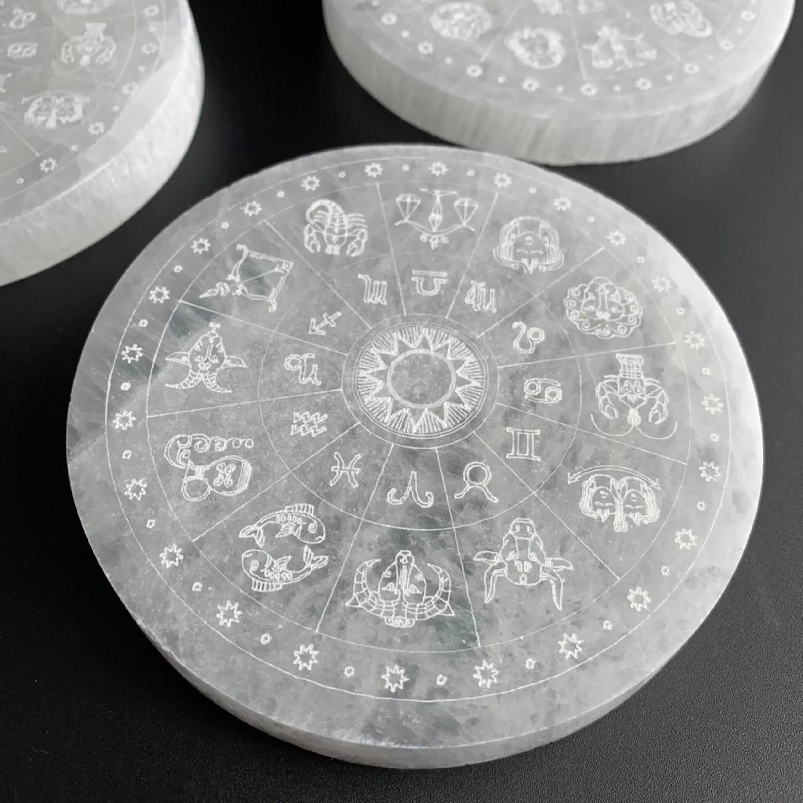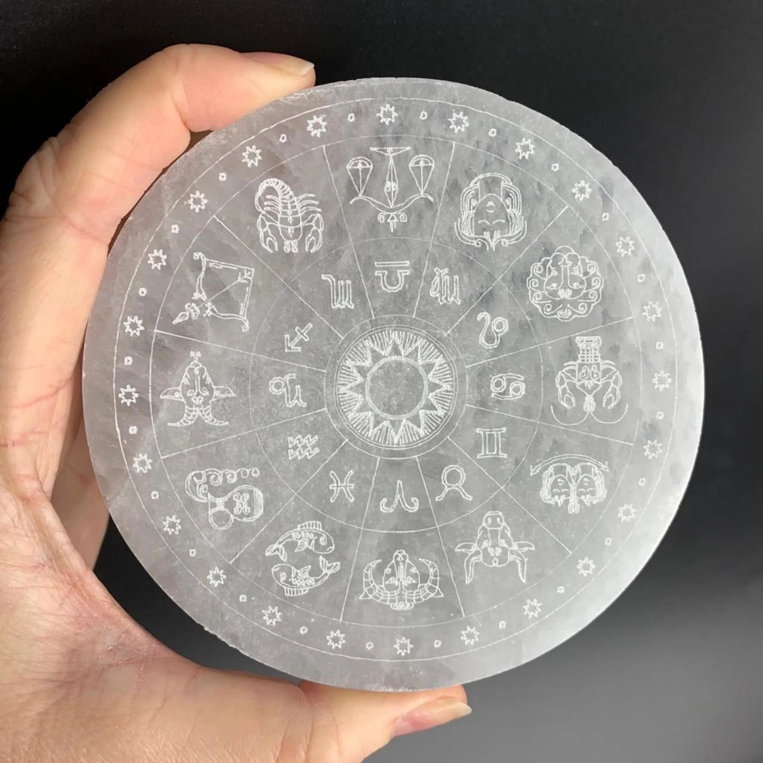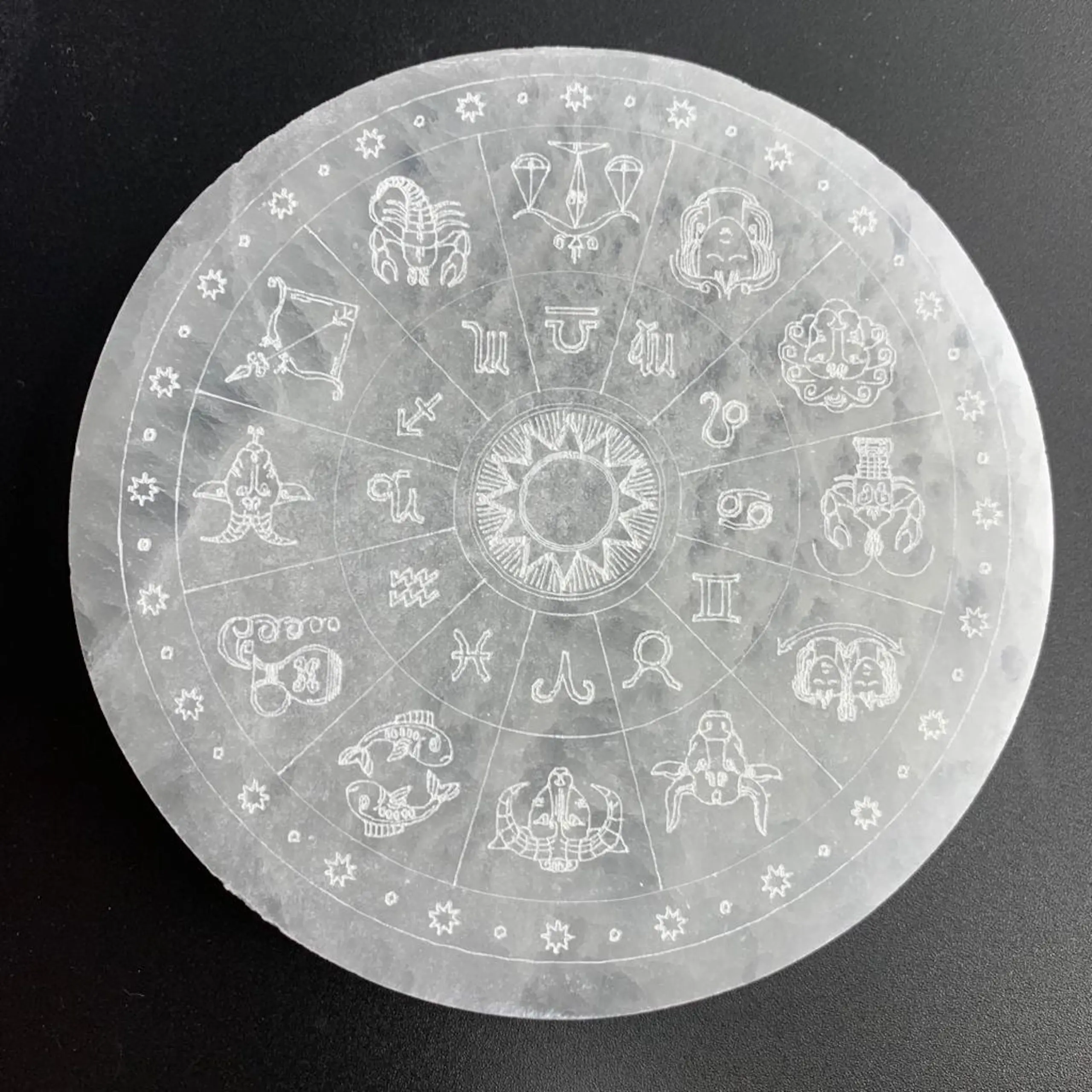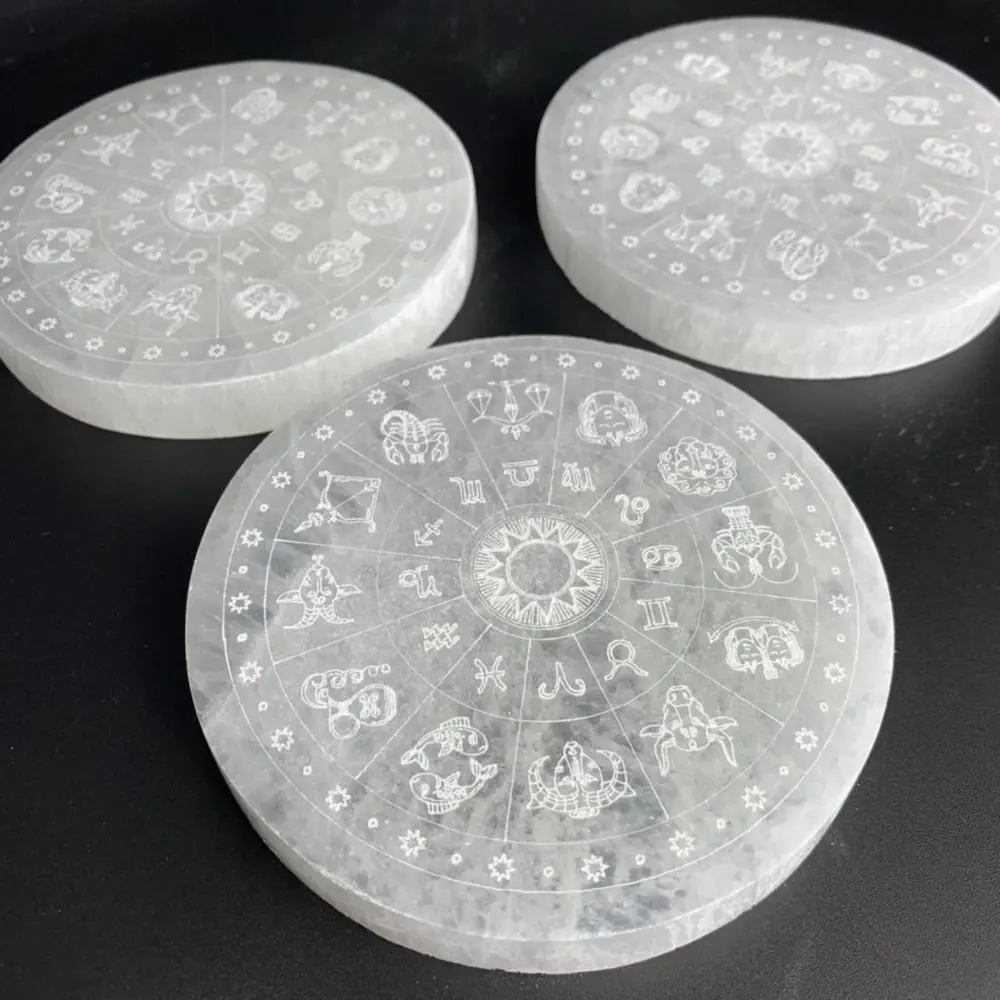 Selenite Flat Round Plate with Zodiac Etching 10cm