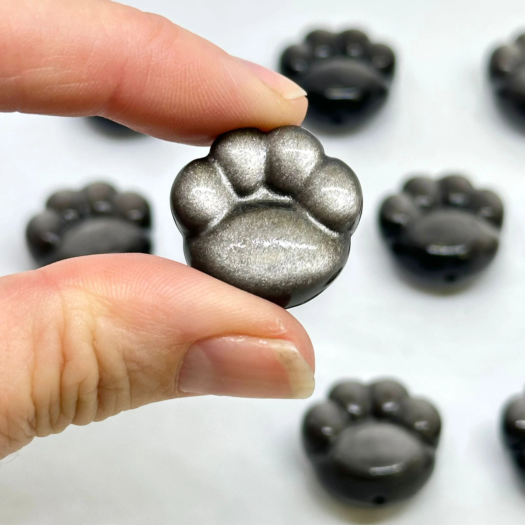 Hand-carved from premium Silver Obsidian, the bead features a detailed paw design.