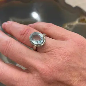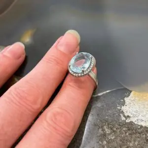 Some years later, on my honeymoon in Sri Lanka, I went to source a huge Sapphire of my own. They were incredibly expensive, so I went for the next best thing – an Aquamarine. I chose one the same shape and size as Diana’s and when asked why that one, I said ‘because it’s the biggest of course’! I have worn it every day since – over 25 years – only parting with it to have it reset (four times!) and cleaned. I have had to have the scratches polished out a couple of times and have lost at least half a Carat doing this. But I won’t take it off!